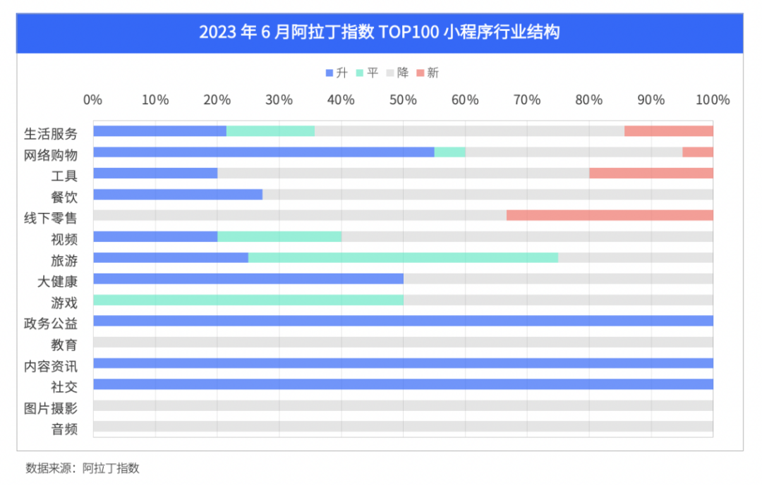 2023 年 6 月阿拉丁指数 TOP100 更替率 10%,生活服务、网络购物、工具类三大类型小程序累计上榜 63 个,较上月增加 3 个。