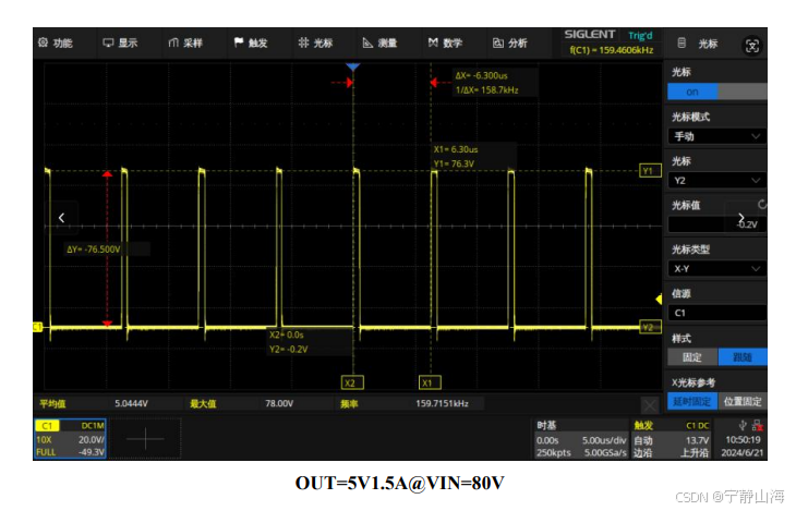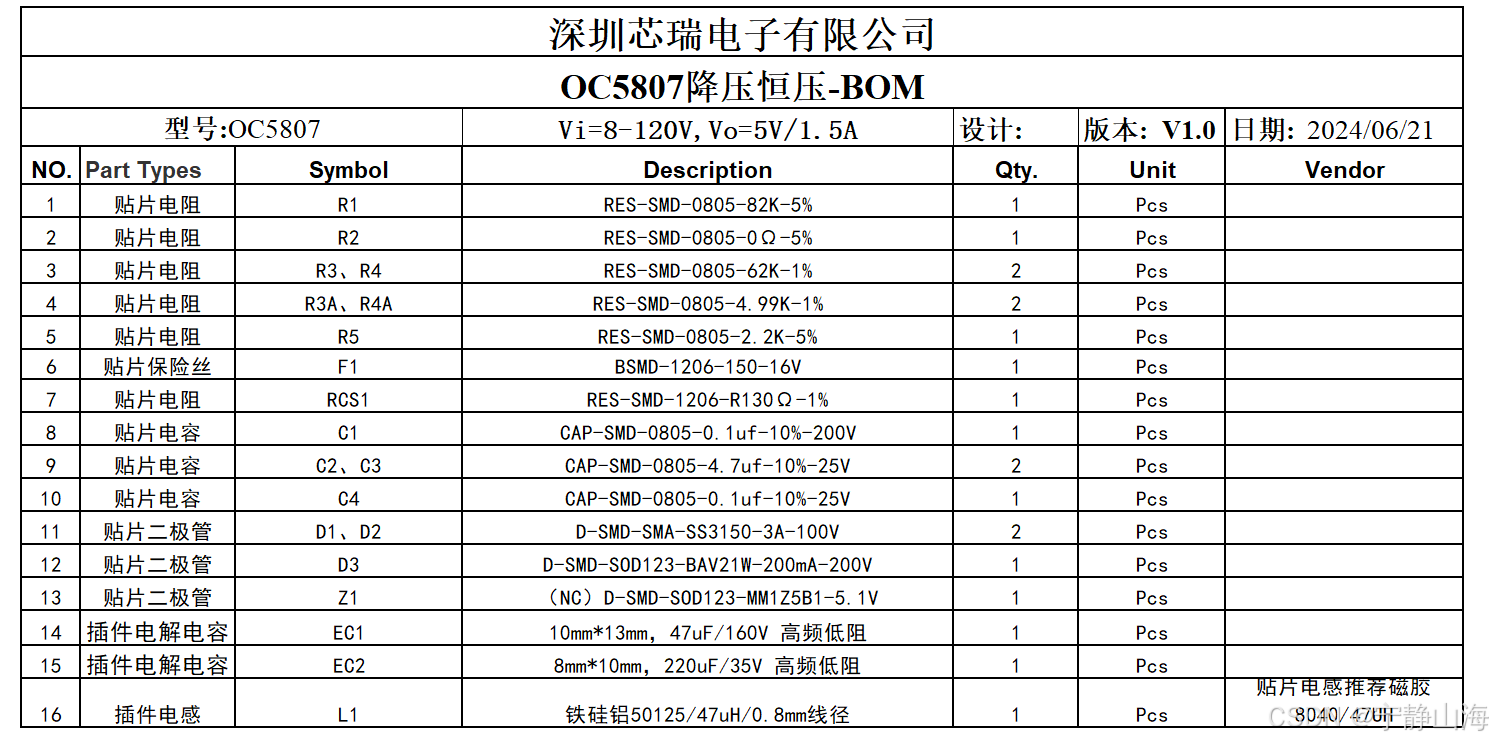 本资料为芯片 OC5807 制作的 DEMO 板,用于 DC8V~130V 输入,输出电压 5V/1.5A。 OC5807典型开关频率为140KHz。OC5807内部集成软启动以及过温保护电路, 输出短路保护,限流保护等功能,提高系统可靠性