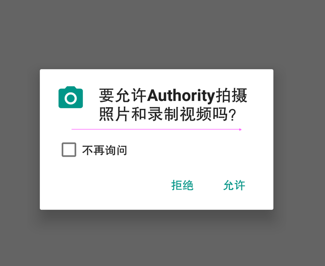 if (permission != PackageManager.PERMISSION_GRANTED) { // 没有写的权限,去申请写的权限,会弹出对话框,第一个参数是上下文,第二个参数是数组对象,第三个参数是唯一对应的请求码,请求码大小要介于0-65535之间 ActivityCompat.requestPermissions(MainActivity.this,new String[]{Manifest.permission.CAMERA},1); }