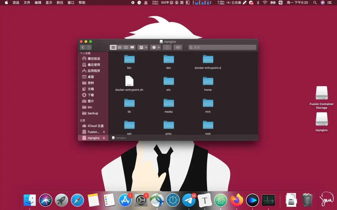 这一步神奇的事情就发生了!当容器被启动时,它的 rootfs 会被挂载到宿主机上,这就意味着我们可以直接使用 Finder 来浏览容器里的内容,并实时修改,就像在宿主机里编辑文件一样,简直太爽了!