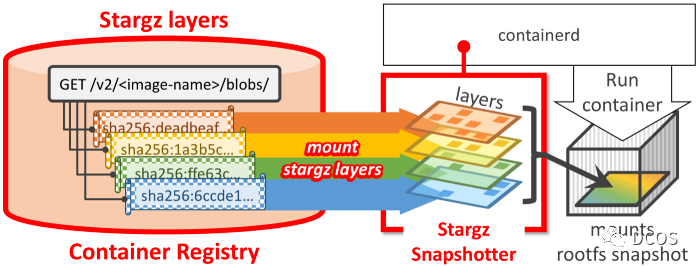 上图是stargz-snapshotter的实现概览,通常的我们在拉取镜像时,要将镜像的每一层拉取下来,而使用stargz-snapshotter后containerd不再是拉取镜像的层,而是为存储在镜像仓库中镜像的每一层在容器运行节点上创建一个目录,通过远程挂载的方式挂到各个目录上。容器启动前再将各个目录做overlay挂载,为容器提供一个rootfs。当需要读取某个文件时,通过网络读取镜像仓库中镜像层中的文件。