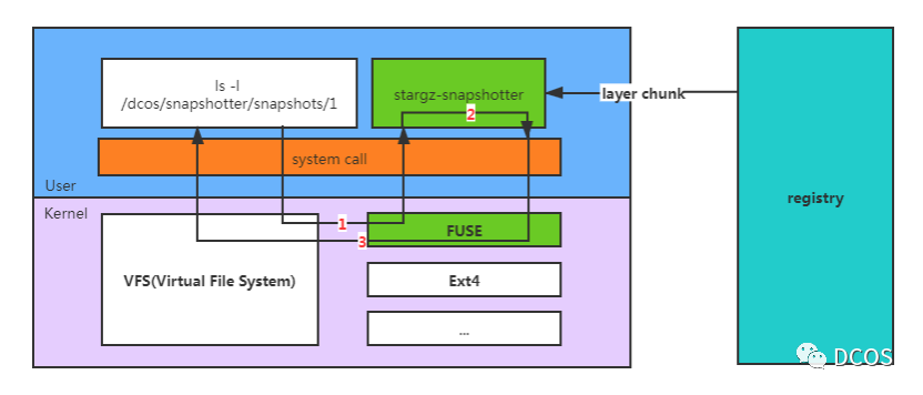 ② FUSE内核模块根据请求类型,调用stargz-snapshotter的逻辑,stargz-snapshotter从镜像仓库中读取该层中的文件