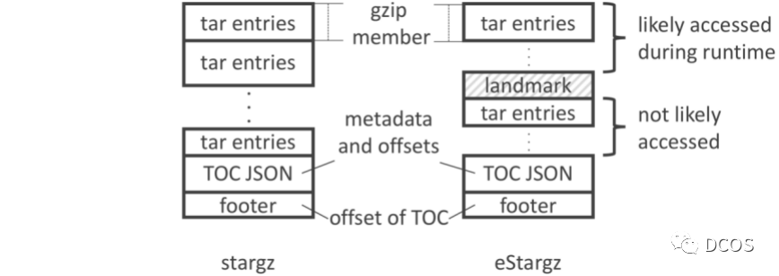 estargz是对stargz格式进行了优化,如上图所示。它多了一个landmark文件,这个文件将镜像层中的文件分成了两类:一类是容器运行时最有可能用到的,另一类是可能用不到的。这样后台任务会优先去缓存那些容器运行时需要的文件,这样会增加本地缓存的命中率,加快容器的启动速度。
