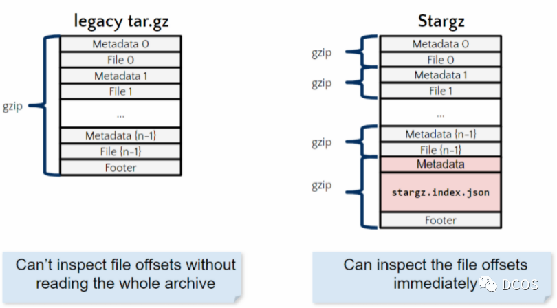 这样就可以通过镜像层最后47个字节的Footer,找到TOC的偏移量,然后读取TOC的内容就能得到整个镜像层中有哪些文件,每个文件的偏移量是多少。Stargz-snapshotter就是通过这个TOC文件去按需检索整个镜像层中文件的。