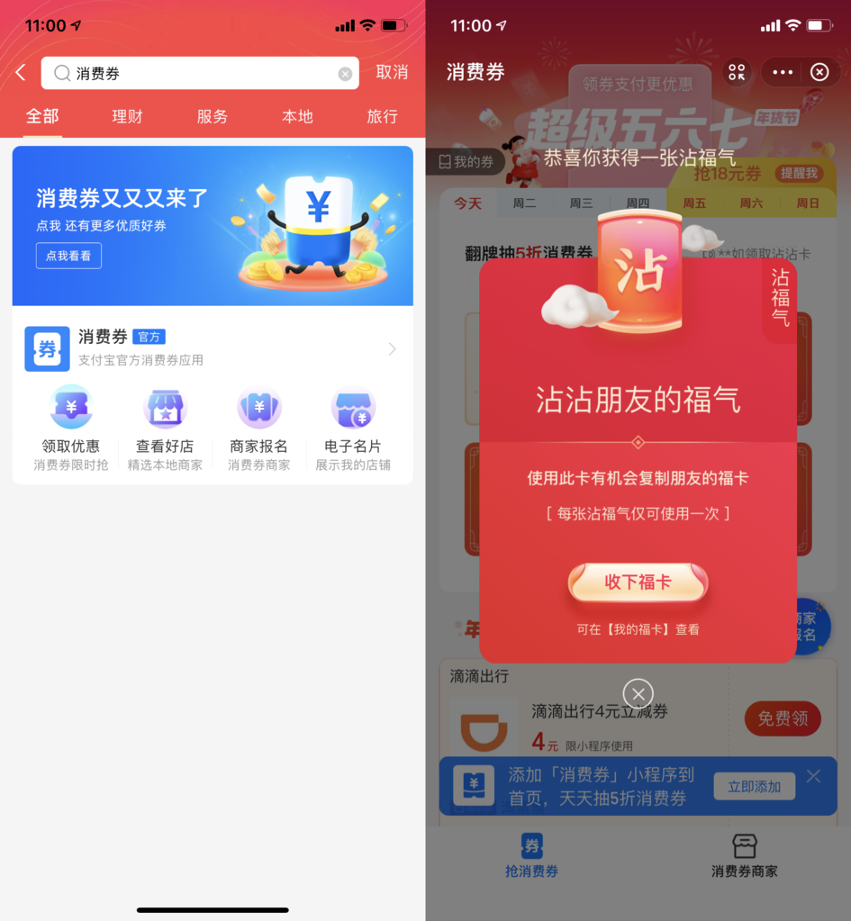 ④ 搜索 “消费券” -> 进入活动 -> 翻卡片 -> 沾沾卡