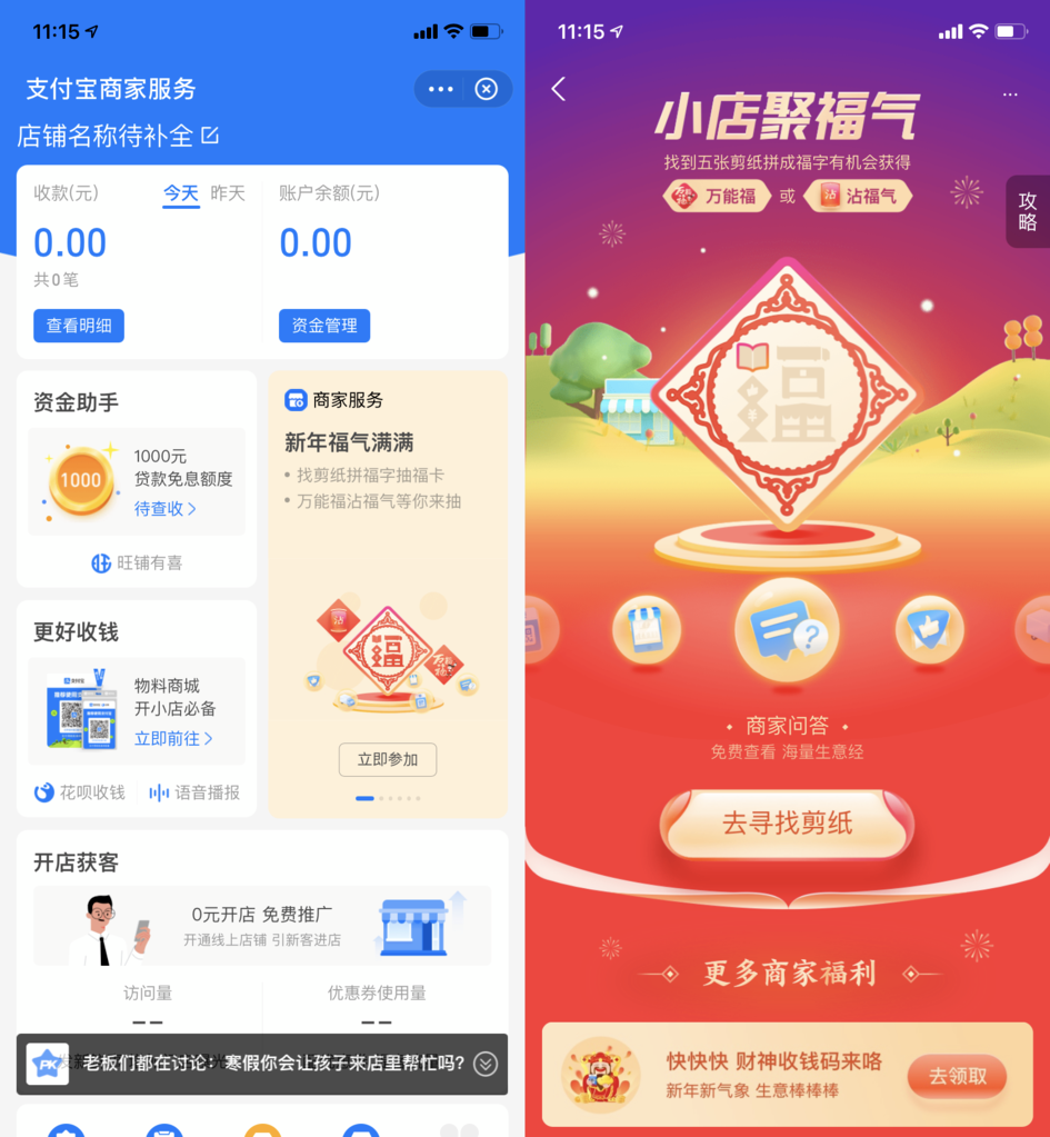 ⑥ 我的 -> 商家服务 -> 右下角剪纸活动 -> 按照提示操作,完成剪纸任务具有机会获得沾沾卡或者万能卡。