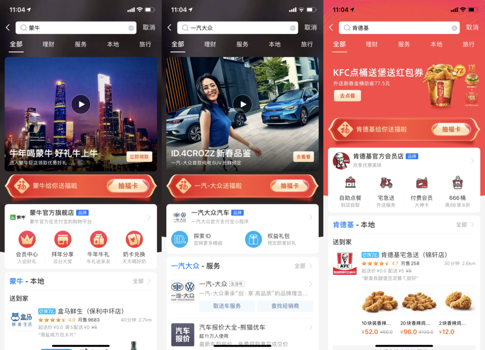 ⑤ 搜索关键字 -> 抽福卡(关键字:滴滴、蒙牛、肯德基、麦当劳、一汽大众、银泰百货、大悦城、爱琴海、星河、砂之船奥莱、薇娅)