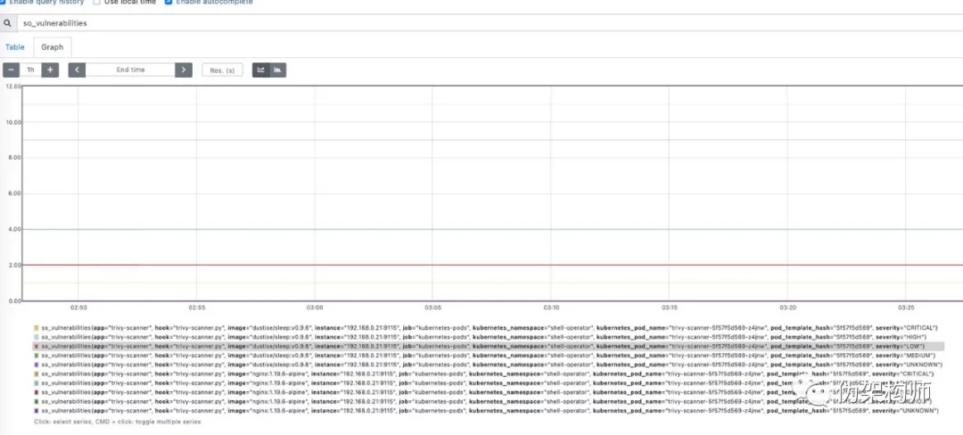 使用 Trivy 获取到 JSON 格式出具的扫描结果之后,就可以利用 Shell Operator 的指标输出能力,把数据整理为如下格式: