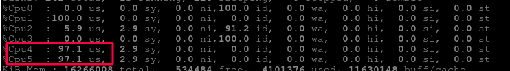 可以看到是被限制到了 cpu 4 和 5 上了,对照一下 top 的 cpu 使用率看是否吻合: