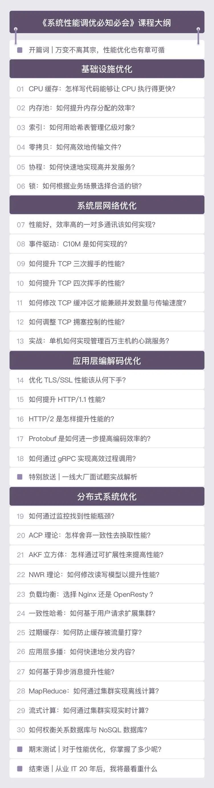 而在这个专栏中,陶辉站在分布式系统的角度,总结了一张以性能为核心的后端技能图谱,详细讲解了全面提升复杂集群性能的方法,和系统性能调优的多种对应策略,都是工作、面试中用得上的、实打实的硬货。