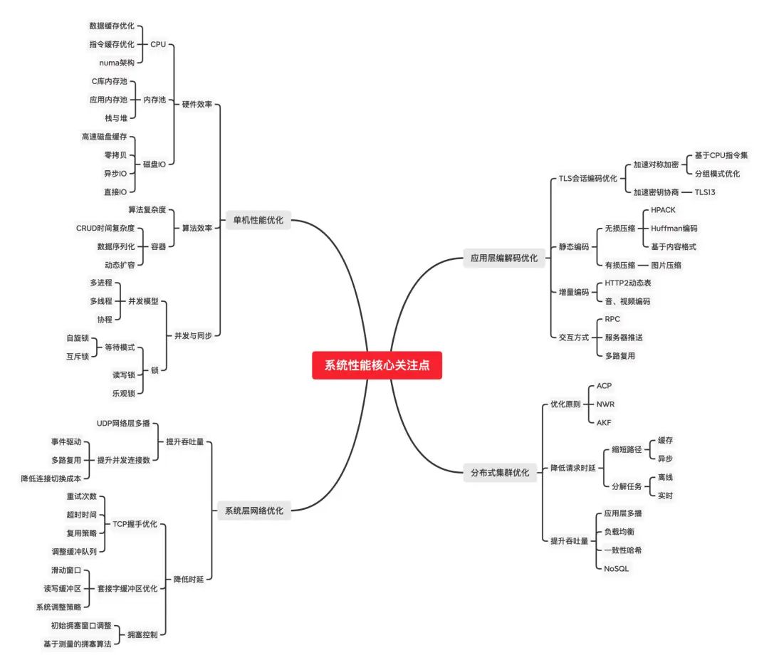所以,无论为了满足业务发的需求,还是在面试、晋升中有更好的表现,系统性能优化都是你绕不开的一关。这里,分享给你一张「系统性能核心关注点」图谱,通过四个层次,帮你切实提升系统性能。