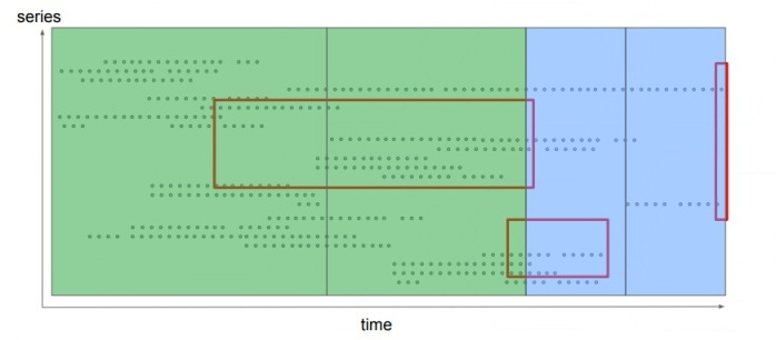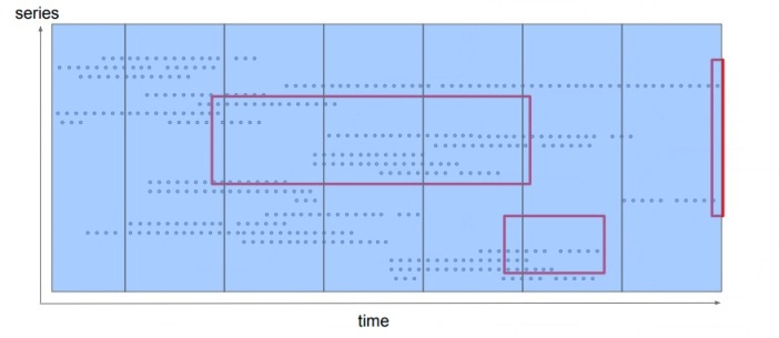 第三代存储引擎将所有时序数据按时间分片,即在时间维度上将数据划分成互不重叠的 blocks,如下图所示: