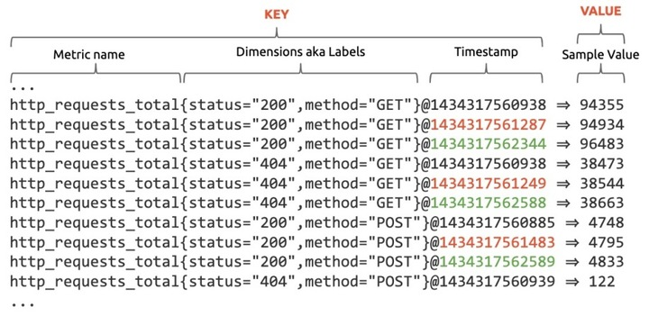 每个样本由时序标识、时间戳和数值 3 部分构成,其所属的时序就由一系列样本构成。由于时间是连续的,我们不可能、也没有必要记录时序在每个时刻的数值,因此采样间隔 (Interval) 也是时序的重要组成部分。采样间隔越小、样本总量越大、捕获细节越多;采样间隔越大、样本总量越小、遗漏细节越多。以服务器机器监控为例,通常采样间隔为 15 秒。