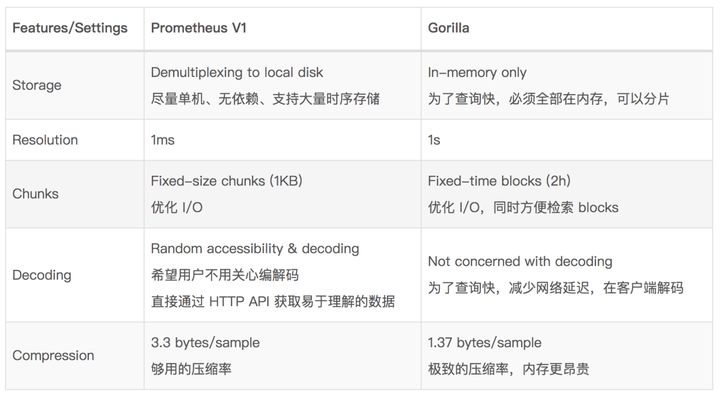 正因为 Prometheus V1 与 Gorilla 的设计理念、需求有所不同,我们可以通过对比二者来理解其设计过程中使用不同决策的原因。