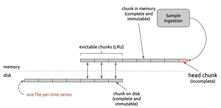 在内存中保留着最近写入的 chunk,其中 head chunk 正在接收新的样本。每当一个 head chunk 写满 1KB 时,会立即被冻结,我们称之为完整的 chunk,从此刻开始该 chunk 中的数据就是不可变的 (immutable) ,同时生成一个新的 head chunk 负责消化新的请求。每个完整的 chunk 会被尽快地持久化到磁盘中。内存中保存着每个时序最近被写入或被访问的 chunks,当 chunks 数量过多时,存储引擎会将超过的 chunks 通过 LRU 策略清出。