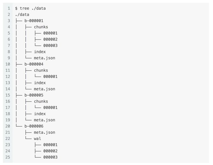 根目录下,顺序排列着编了号的 blocks,每个 block 中包含 index 和 chunk 文件夹,后者里面包含编了号的 chunks,每个 chunk 包含许多不同时序的样本数据。其中 index 文件中的信息可以帮我我们快速锁定时序的标签及其可能的取值,进而找到相关的时序和持有该时序样本数据的 chunks。值得注意的是,最新的 block 文件夹中还包含一个 wal 文件夹,后者将承担故障恢复的职责。