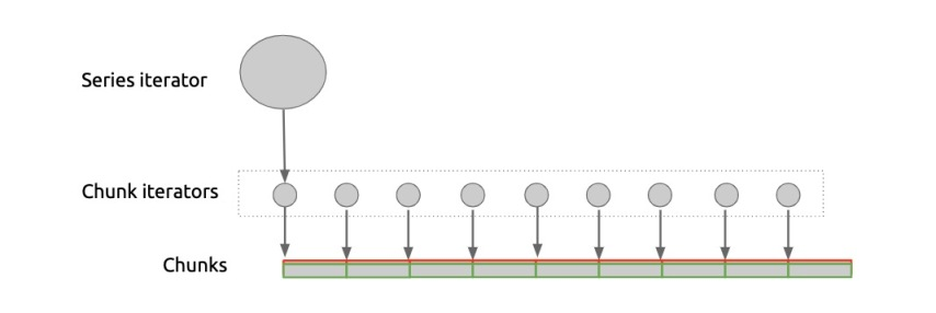应用层使用 Series Iterator 顺序访问时序中的样本,而 Series Iterator 底下由一个个 Chunk Iterator 拼接而成,每个 Chunk Iterator 负责将压缩编码的时序数据解码返回。这样做的好处是,每个 Chunk 甚至可以使用完全不同的方式编码,方便开发团队尝试不同的编码方案。