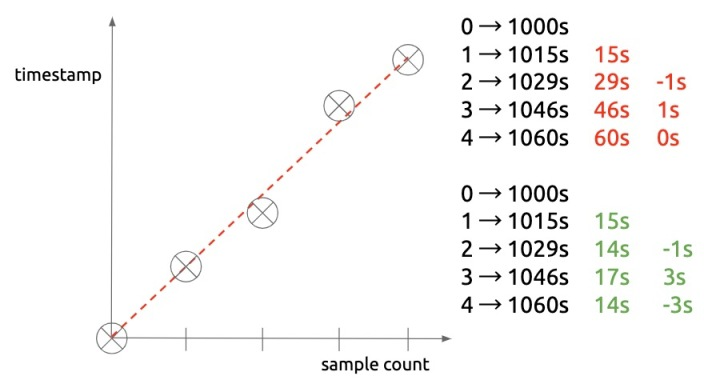 由于通常数据采样间隔是固定值,因此前后时间戳的差值几乎固定,如 15s,30s。但如果我们更近一步,只存储差值的差值,那么几乎不用再为新的时间戳花费额外的空间,这便是所谓的 “Double Delta“。本质上,如果未来所有的采集时间戳都可以精准预测,那么每个新时间戳的信息熵为 0 bit。但现实并不完美,网络可能延迟、中断,实例可能遇到 GC、重启,采样间隔随时有可能波动:
