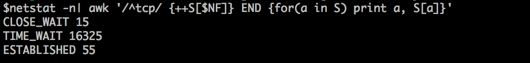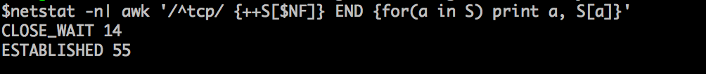 $ netstat -n| awk '/^tcp/ {++S[$NF]} END {for(a in S) print a, S[a]}'