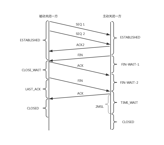 等待 2MSL 时间,主动方结束 TIME_WAIT ,进入 CLOSED 状态