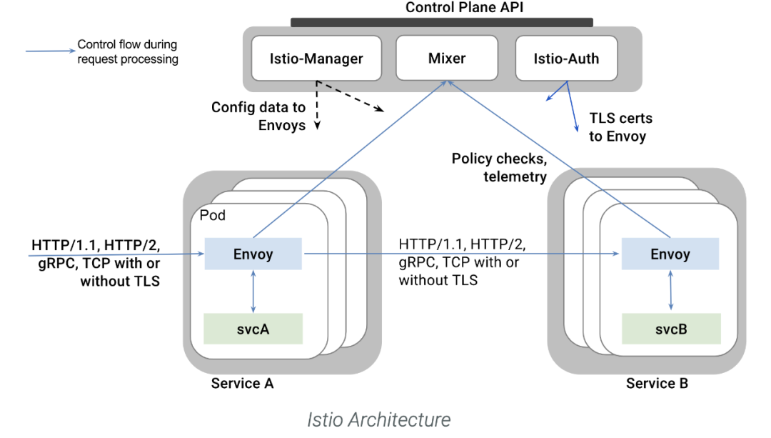 service mesh 一般分为控制面(control plane)和数据面(data plane),控制面(istio)负责管理与下发数据面需要的各种配置并保证配置信息的一致性;数据面(envoy、mosn)负责请求的转发以及稳定性有关的一切。