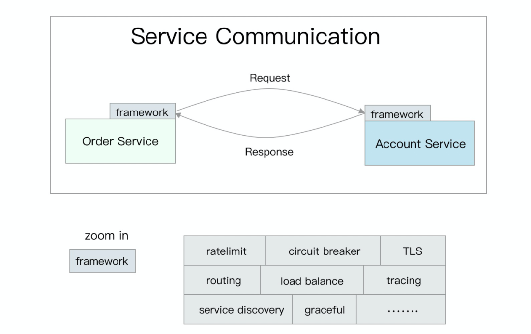 上面这张图里的框架功能,要为每一门公司内使用的语言实现一份。如果碰到了问题(比如 tls 的 0day 漏洞),要去每门语言里的 SDK 里修一遍。