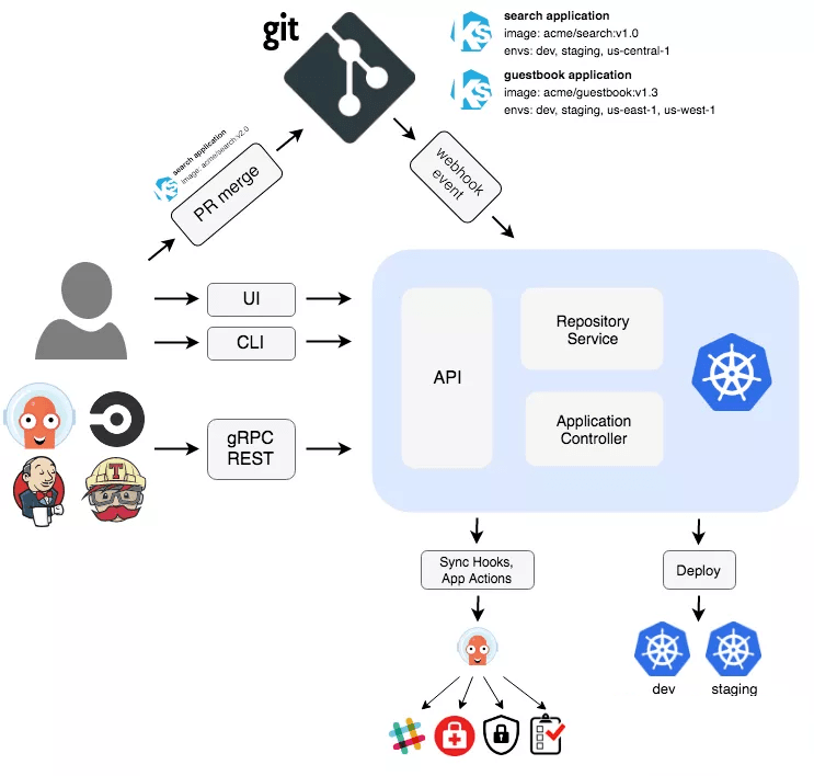 ArgoCD 是一款开源且主要针对 Kubernetes 来做 GitOps 的持续交付工具。现在是 CNCF 的孵化项目。其整体架构图如下: