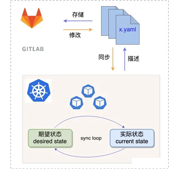 这其实就是实现 GitOps 的核心原理。所有对于应用程序或者基础设施的变更仅仅需对 Git 仓库做一些 MR 或者 Push 操作即可实现,变更会自动部署。所以,虽然 GitOps 的核心不是 Git,但是却与 Git 息息相关。