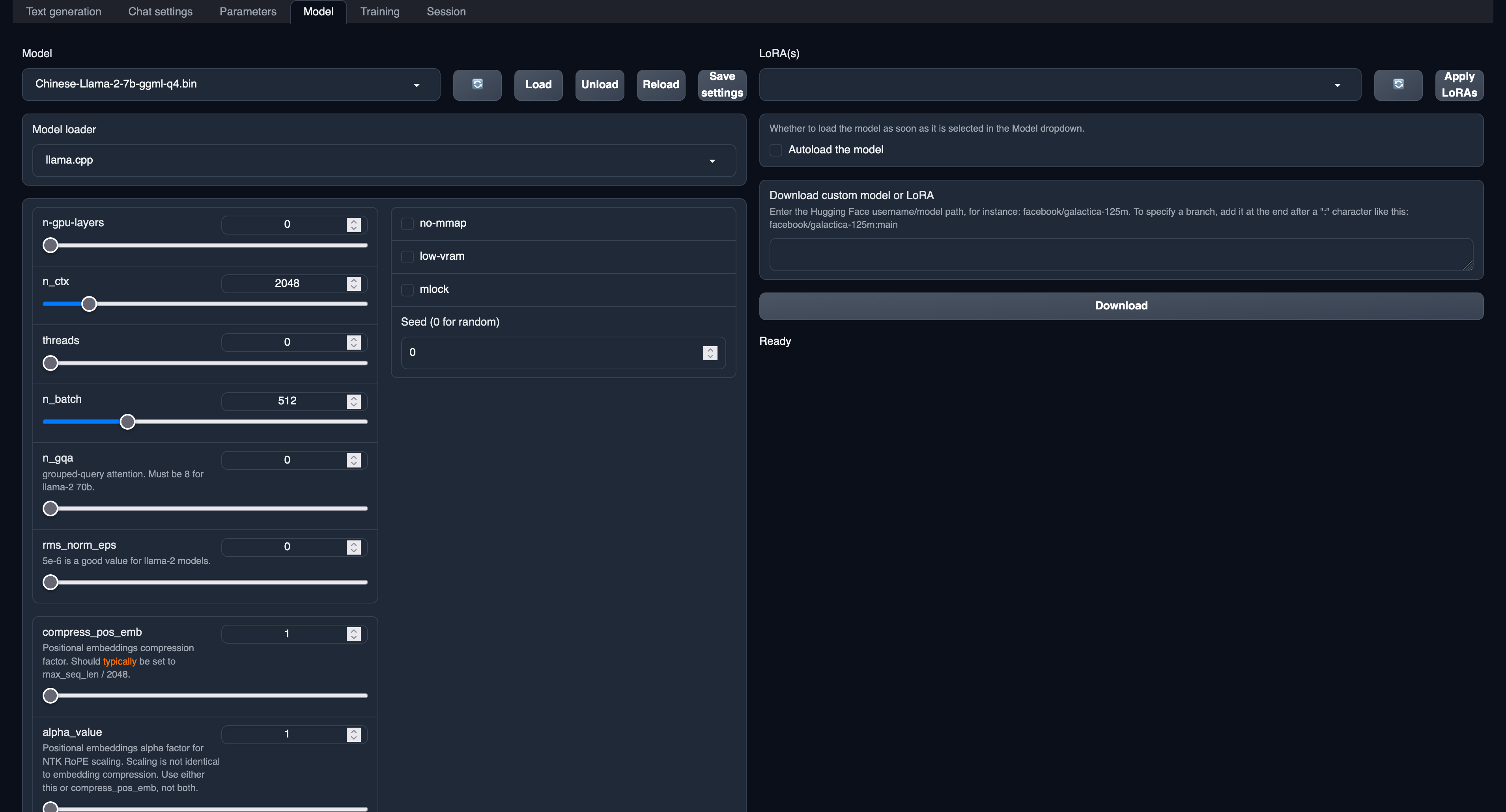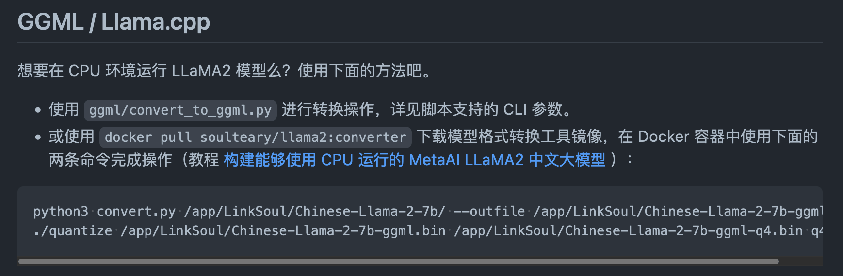 有社区小伙伴已经转换好了模型并上传到了 Hugging Face,咱们直接拿来主义:https://huggingface.co/soulteary/Chinese-Llama-2-7b-ggml-q4