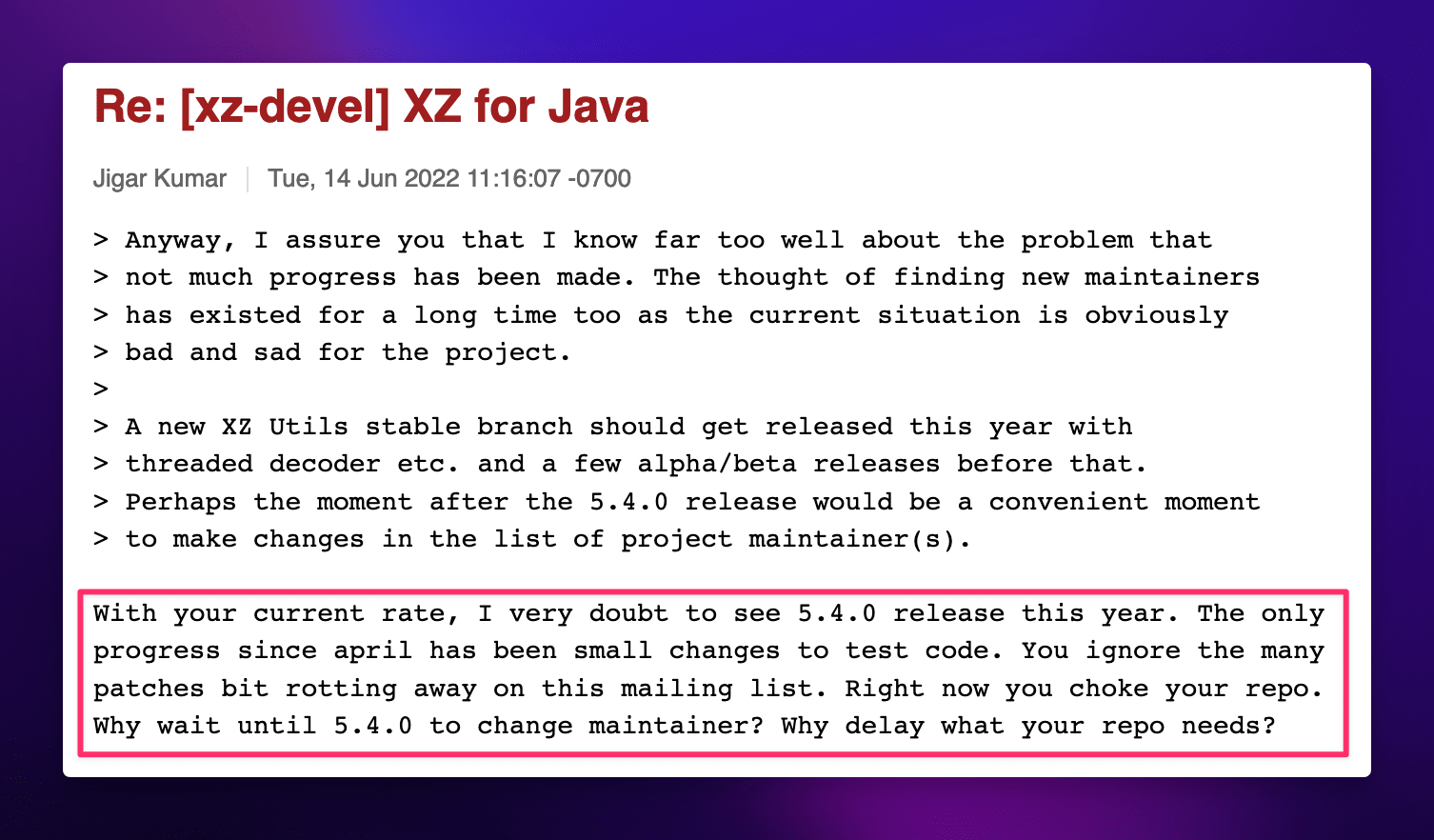 在 “索取党” 的不断締逼下,Lasse 的维护热情迅速消磨殆尽。他开始怀疑自己是否真的能胜任这个角色。正当 Lasse 处于人生的低谷时,Jia Tan 再次向他伸出了 “援手”:“不如把项目交给我吧,我会好好打理的。”