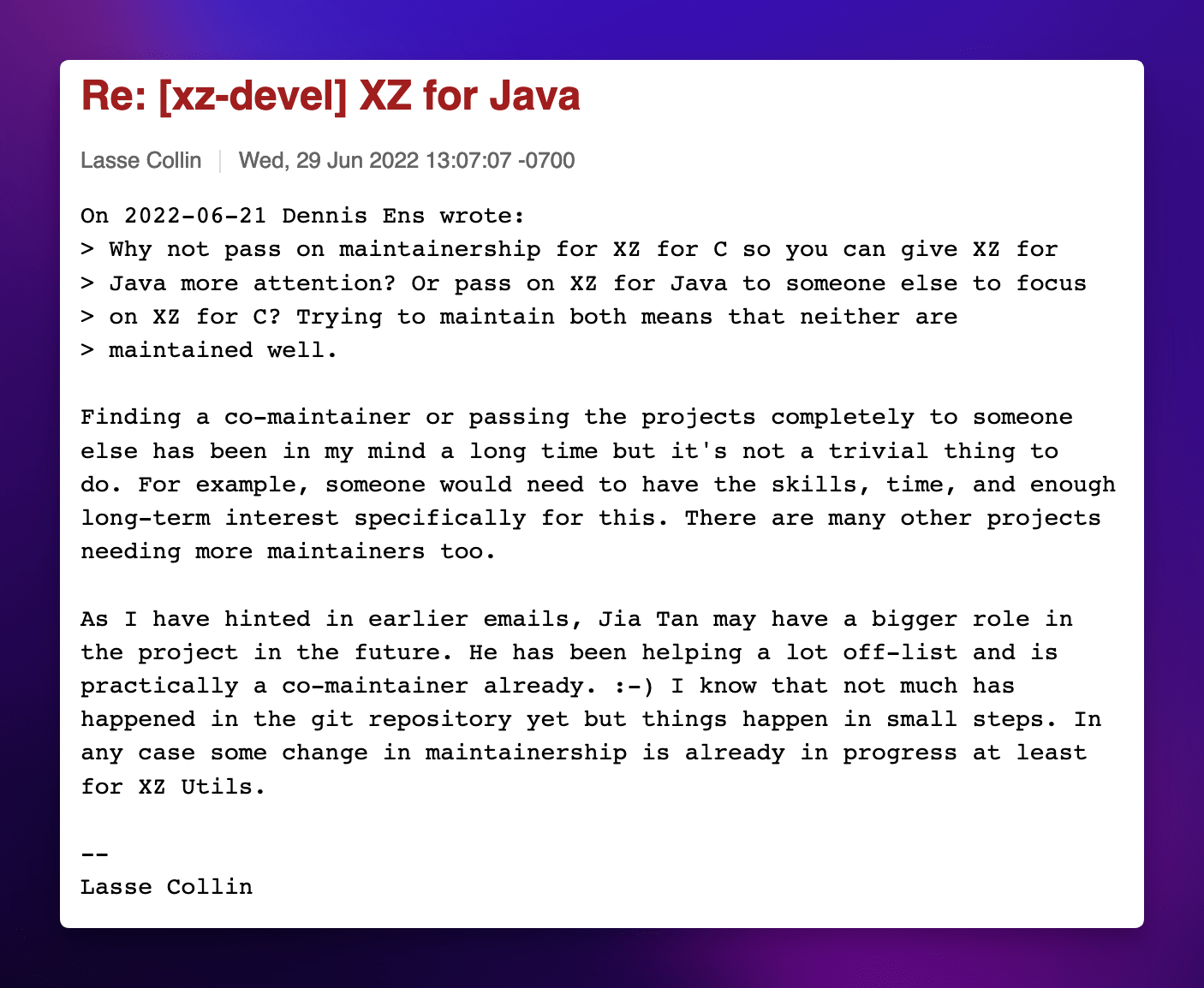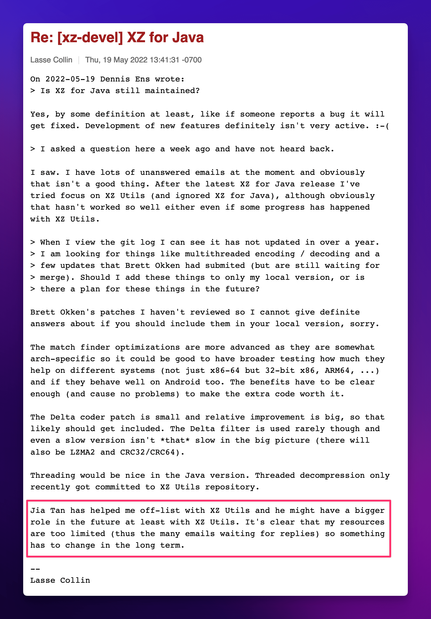就在这时,一个名叫 Jia Tan 的开发者出现在 Lasse 面前,表示愿意帮助维护项目。Jia Tan 在私下里也给了 Lasse 不少支持和鼓励。“太好了,终于有人能分担一些工作了。” Lasse 心里的石头落了地。
