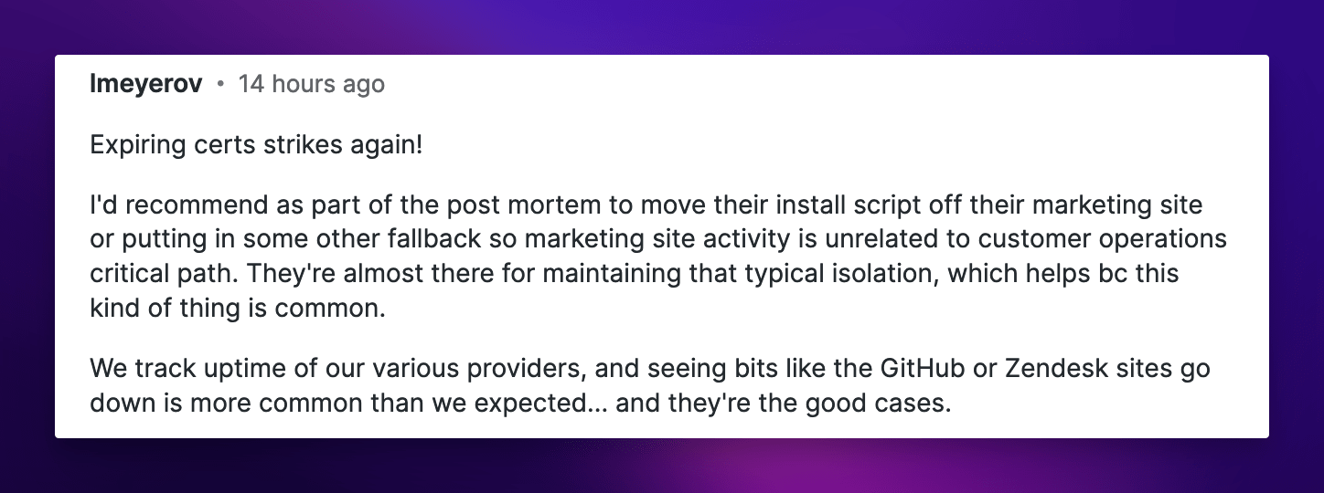 网友们纷纷表达了自己的看法。smackeyacky 感慨道:“我说过一次,现在我要再说一次:证书过期已然成为新时代服务中断的头号杀手。”