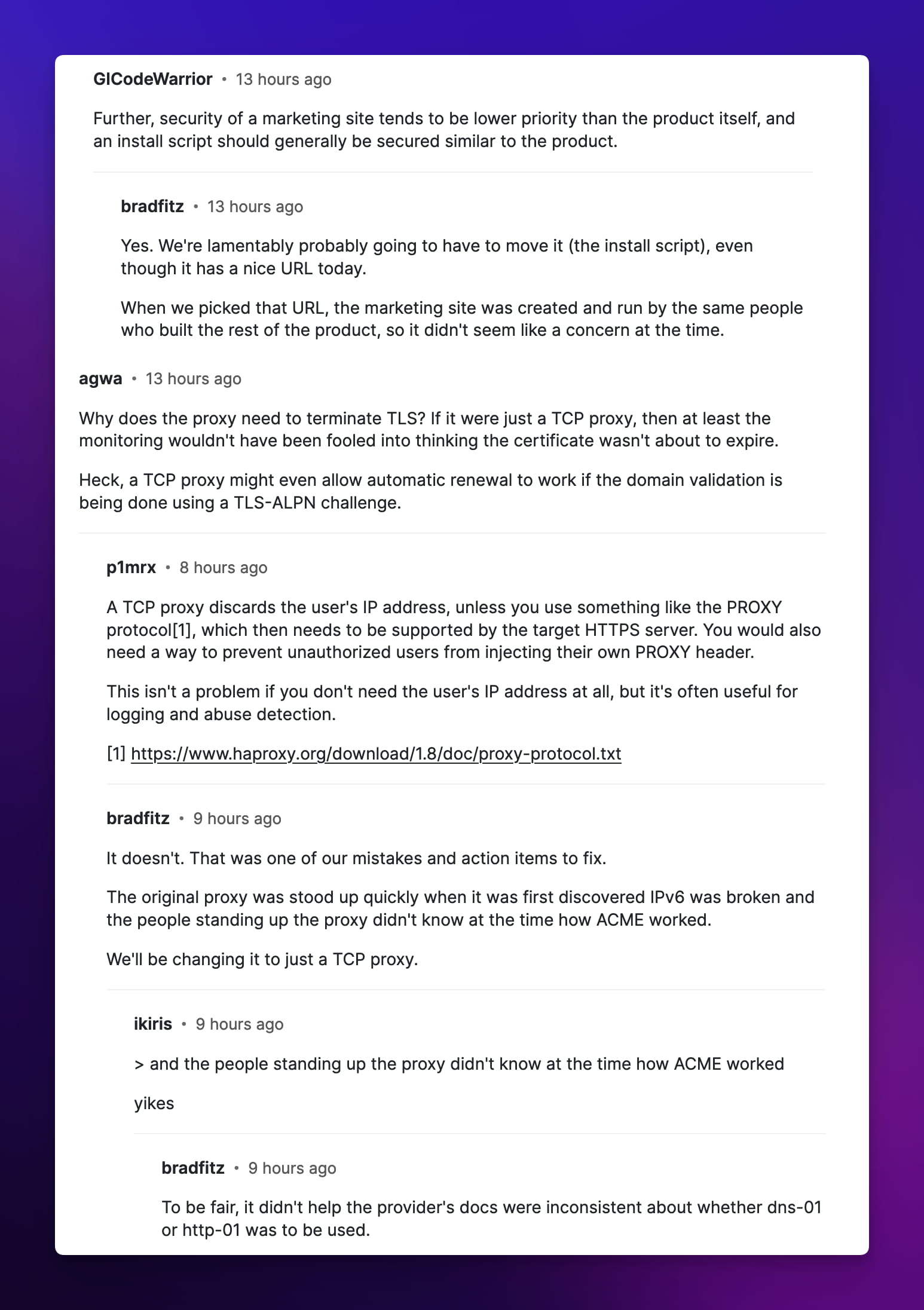 Tailscale 联合创始人 bradfitz 也第一时间在 Hacker News 回应,介绍了事发原因和应对过程。原来,他们在去年12月进行了一次大规模的网站迁移,涉及底层架构、域名解析等多个环节的重构。为了支持 IPv6,他们还特意搭建了额外的代理服务器。