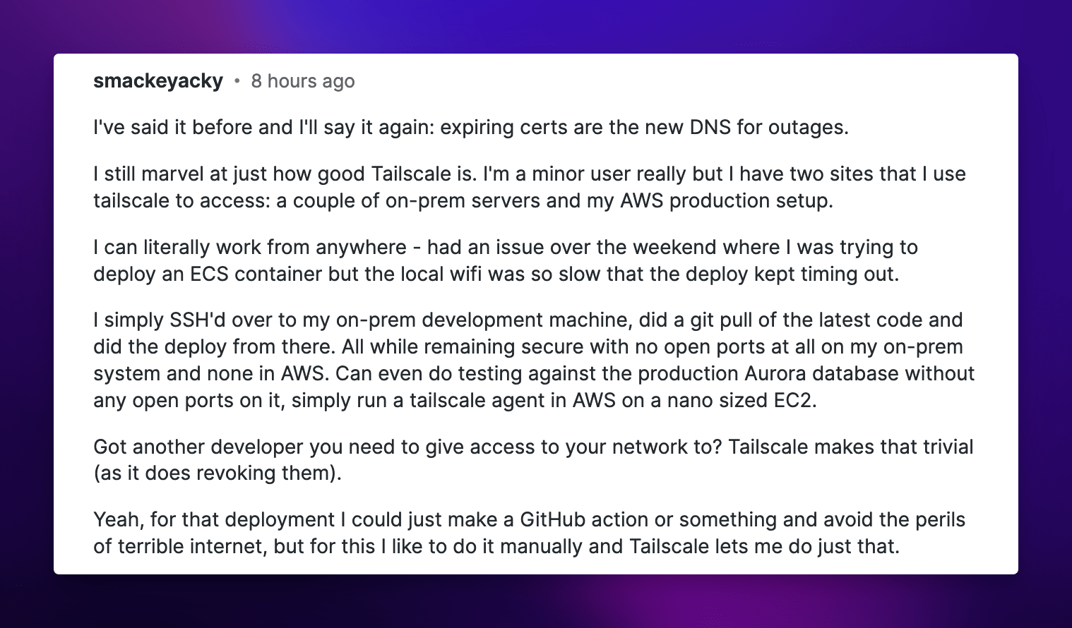 尽管 Tailscale 因 TLS 证书过期导致了90分钟的服务中断,但这恰恰凸显了它的一大优势——多数用户几乎没有受到影响。Tailscale 的分布式架构使得用户端的连接不依赖于中心节点始终在线。这种弹性设计是 Tailscale 区别于传统 VPN 的关键所在。短暂的中心服务中断并不能否定 Tailscale 的价值,反而凸显了其良好的容错性。