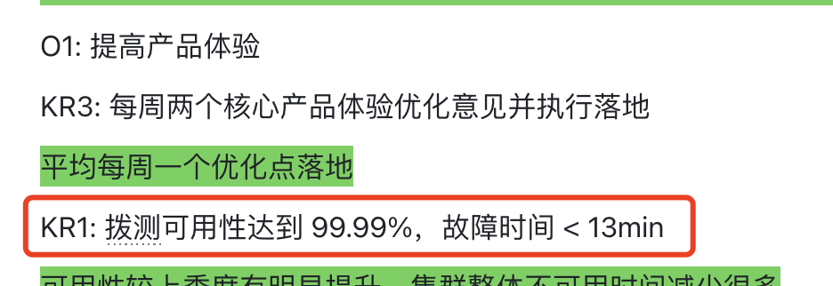 比如,如果设定 99.9%,如何达到?那么当前的可用性是多少?当前的核心问题是什么?如何测量?需要做些什么?谁来做?设定不局限于可用时长,要列细一些,比如故障等级、故障次数、故障时长、大客户故障观测等等。