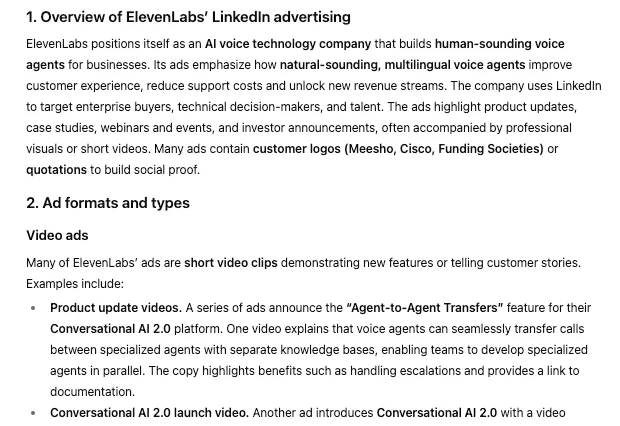 我用这个完全一样的提示词(以 AI 创业公司 ElevenLabs 为例),得到了这样一份报告[6]: