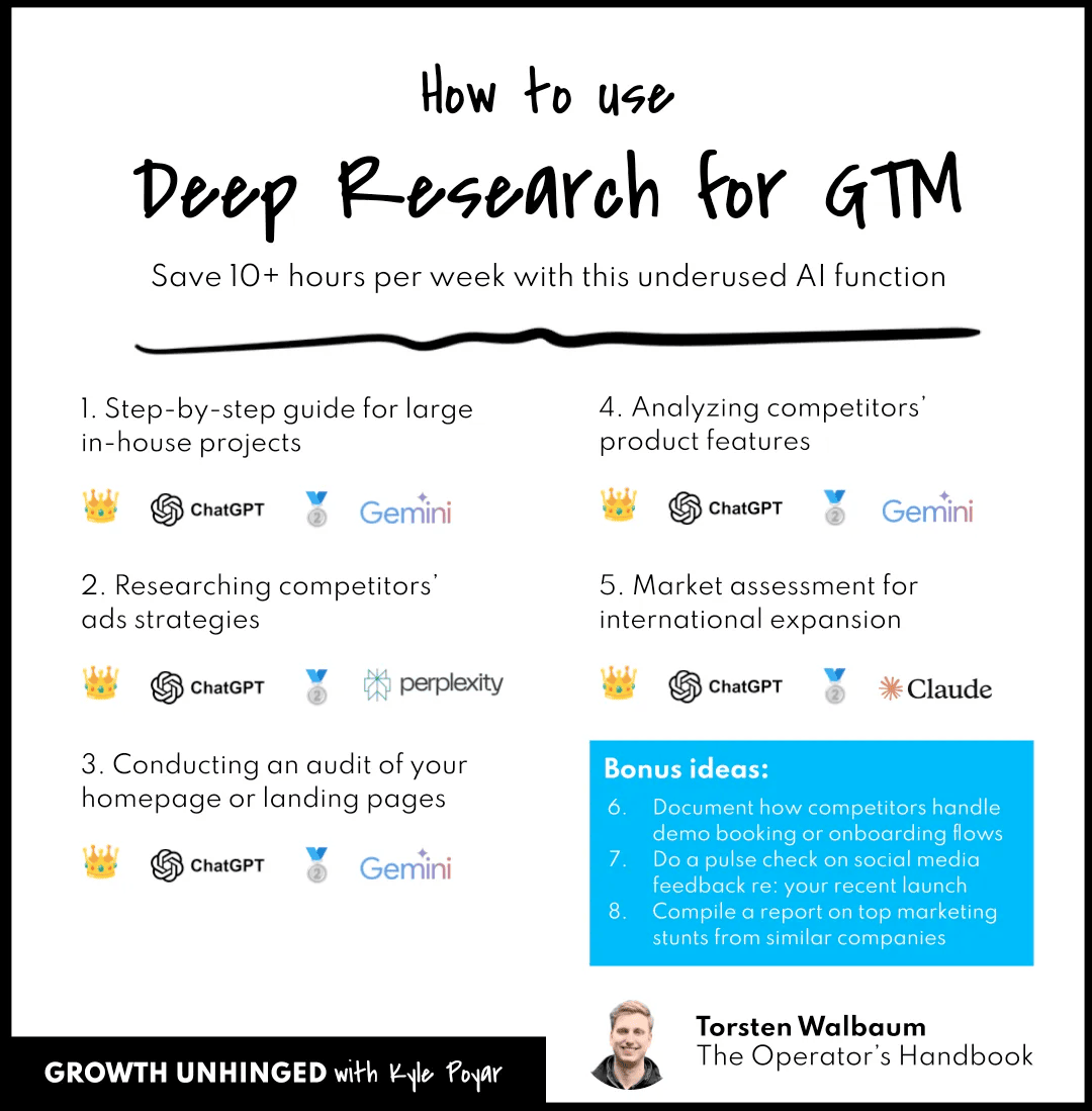 我最近彻底迷上了 ChatGPT 和 Perplexity 的“深度研究”(Deep Research)模式。无论是为这份简报搜集资料,还是为任何需要密集调研的GTM(进入市场)项目做准备,这个功能都给我省下了大把时间,多到我自己都数不清。这绝对是目前最强大、却又最容易被忽视的 AI 功能之一。今天,咱们就来给它正名。