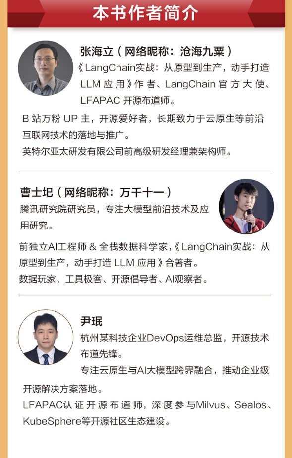 本书的几位作者皆为资深开发者,拥有多年AI与后端工程经验,曾深入研究并撰写过关于LangChain的技术专栏和图书,对该公司产品的发展脉络和设计理念有深入理解。其中,海立老师作为 LangChain官方社区在中国目前唯一的技术大使(LangChain Ambassador),从LangChain到LangGraph,他是少数一路追踪、实战过这条技术演进路径的人之一。