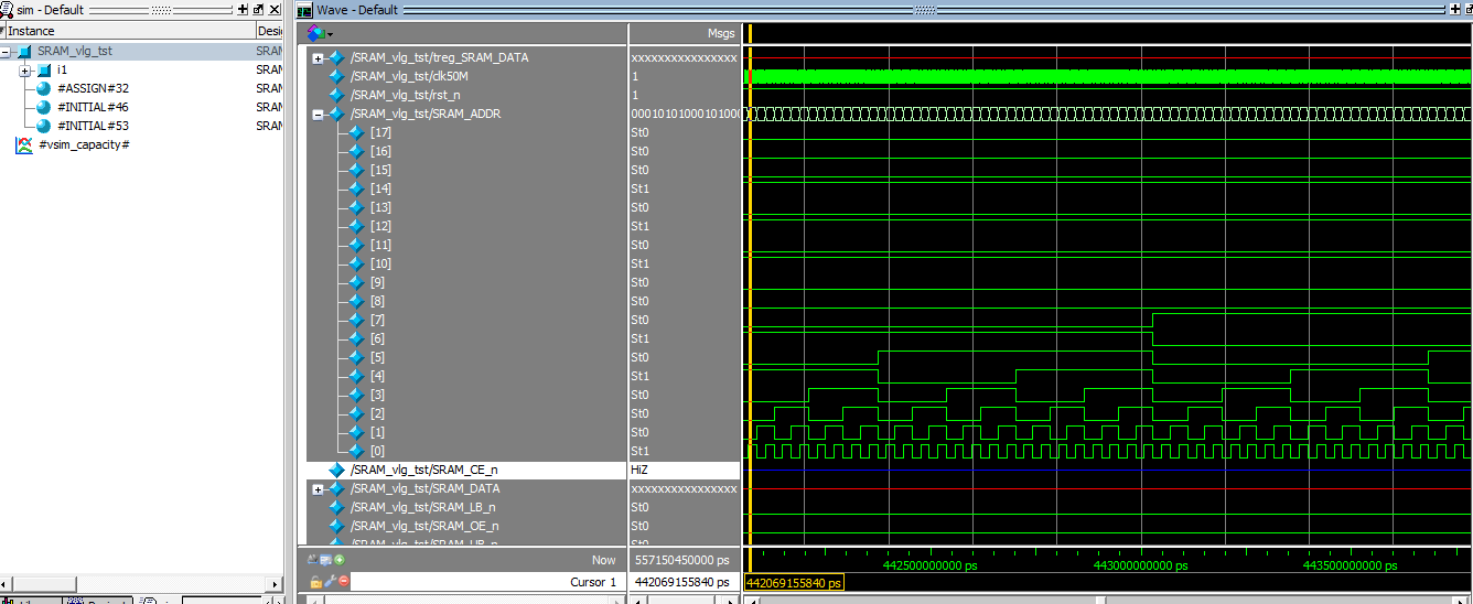 通过放大/缩小波形,可以观察到ssram的地址值在保持变化,即ssram的时序效果。若将其移植到Quartus II中,适当配置后,经过综合、时序分析、引脚分配、配置及下载等,即可实现ssram读取比较正误的效果。