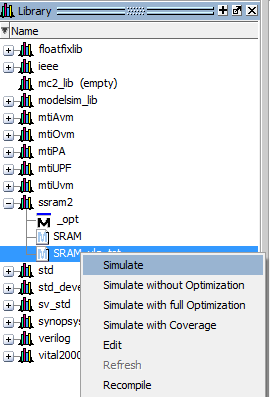 1. 单击Library图标,选择ssram2,单击+以展开选项,然后选择SRAM_vlg_tst。单击右键,选择simulate编译(或者进行双击),如图3.1所示。
