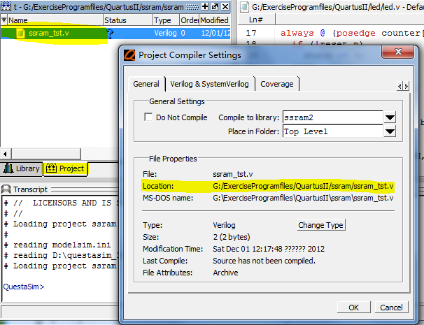 下面将这一过程重新展示一遍,在“艾米电子”blog中采用的是ModelSim-Altera 6.5e (Quartus II 10.0) Starter Edition,在参考作者原来的基础上,我采用的平台是QuartusII11.1 +Questasim 10.0c(同为Mentor公司出品,Modelsim的增强版)