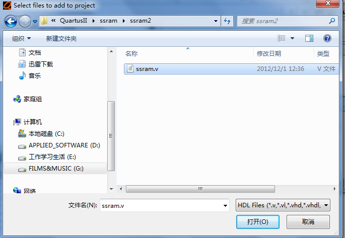 2. 输入文件名称ssram_tst,在Add file as type(文件类型)中选择Verilog