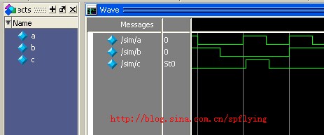 module test_sim( a, b, c ); input a; input b; output c; assign c = a & ( ~ b); endmodule //仿真激励: `timescale 1ns/1ps `define period 10 module sim (); reg a; reg b; wire c; initial begin # (`period * 10) a = 1'b0; # (`period * 10) b = 1'b0; # (`period * 1000) $stop; end always #(`period * 10) a = {$random} % 2; always #(`period * 15) b = {$random} % 2; test_sim t_sim ( .a(a), .b(b), .c(c) ); endmodule