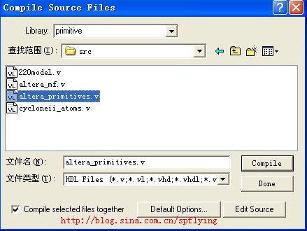 在主菜单中选【compile】→【compile】命令,对altera_primitives.v进行编译。