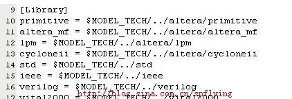 将modelsim 根目录下的配制文件modelsim.ini的属性只读改为可写,用记事本或者Ultraedit等其他文本编辑软件打开它。如下图所示添加此库(注:第一步的工程必须在modelsim的安装目录下才能使用此相对路径)。注意修改后关闭并改回只读属性。