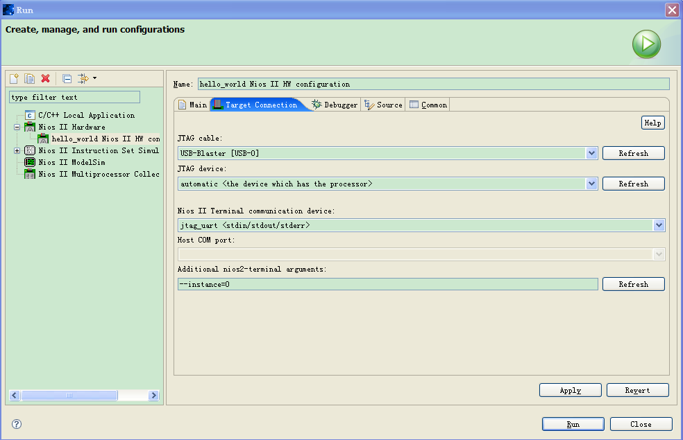 解决:run->run...->工程名 Nios_HW configuration->Target Connection/JTAG Cable项选择USB-Blaster