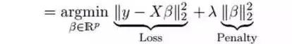 在这个公式中,有两个组成部分。第一个是最小二乘项,另一个是β2(β-平方)的λ倍,其中β是相关系数。为了收缩参数把它添加到最小二乘项中以得到一个非常低的方差。