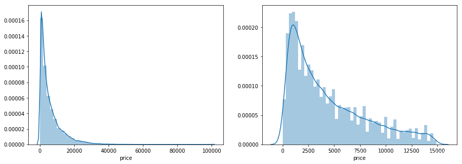 且预测值price出现负数,查看price分布 出现长尾分布 不符合正态分布。