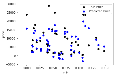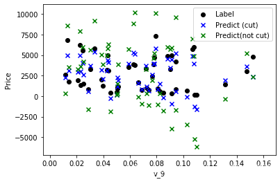 绘制特征v_9的值与标签的散点图,图片发现模型的预测结果(蓝色点)与真实标签(黑色点)的分布差异较大。
