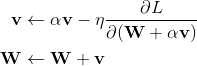 现在,我们假设当前的W就是1处的参数,但是,当前的动量v仍然是0处的动量,那么更新方式就可以写作: